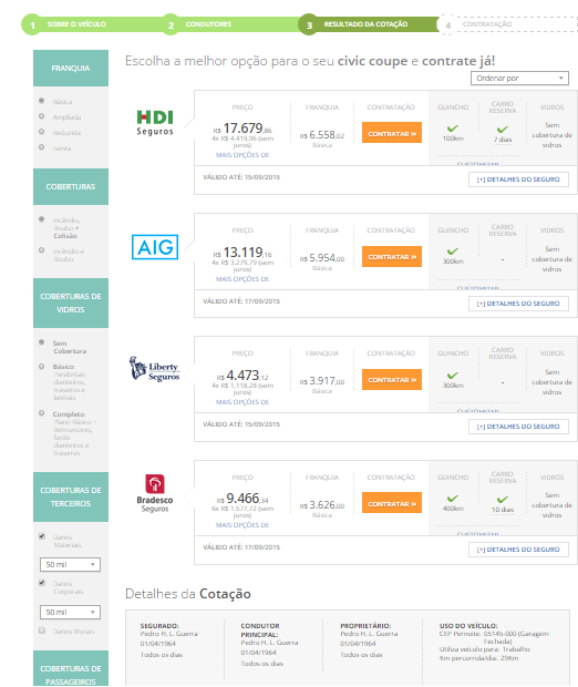 Exemplos de cotação de seguro total anual do Honda Civic Si: