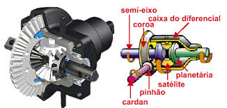 Os principais componentes do diferencial são: cardan (saída das engrenagens de foça e entrada no diferencial), semi-eixos direito e esquerdo(saída do diferencial para as rodas), coroa, pinhão, planetários e satélite. Estas últimas são as responsáveis por compensar a velocidades das rodas interna e externa. Abaixo, uma figura mostra sua composição: