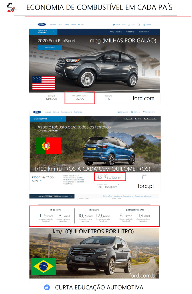 Para verificar como as medidas de consumo e autonomia de combustível, a depender dos parâmetros mais populares em cada mercado. O Ford EcoSport funciona como exemplo ilustrativo, pelo fato de ser um modelo oferecido nos mercados brasileiro, norte-americano e europeu. Os números foram extraídos dos sites Ford USA (ford.com), Ford Portugal (ford.pt) e Ford Brasil (ford.com.br) em 23/06/2020.
